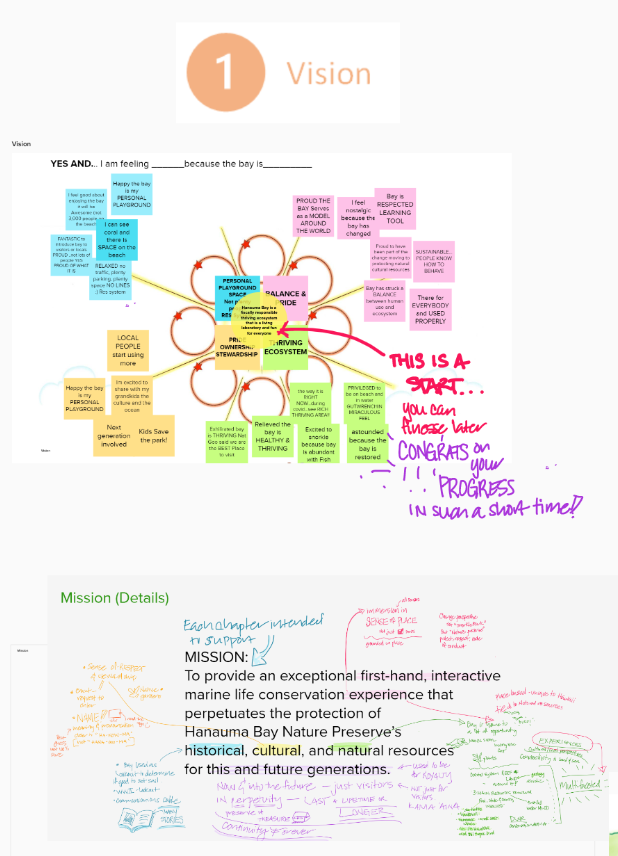 EcoJuju facilitated a series of virtual, interactive meetings between strategic partners, including the City & County of Honolulu, the O’ahu Department of Land & Natural Resources (DLNR), Hawaii Ocean Safety, and Friends of Hanauma Bay. The goal was to bring all parties together, align on priorities, and chart a clear path forward. Differences in jurisdictional authority had created silos and confusion, preventing progress. In just under five hours—across three virtual sessions—participants achieved the following: