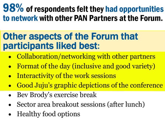 Over 175 attendees at the PAN forum on public health and policies united to create a vision and a comprehensive list of actions, tasks and legislative support needs. Good Juju designed the meeting process and collaborative tools including live graphic recording, interactive wall displays and custom templates.