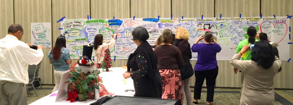 Enhance your outcomes. We’ll help you capture content, build trust, and help teams “see the big picture”, find connections, and problem solve faster with more consensus. We’ll custom design graphic tools, learning games and interactive work templates that support your process increase participation, efficiency and focus. And we can offer facilitative support in large groups or dynamic complicated scenarios.