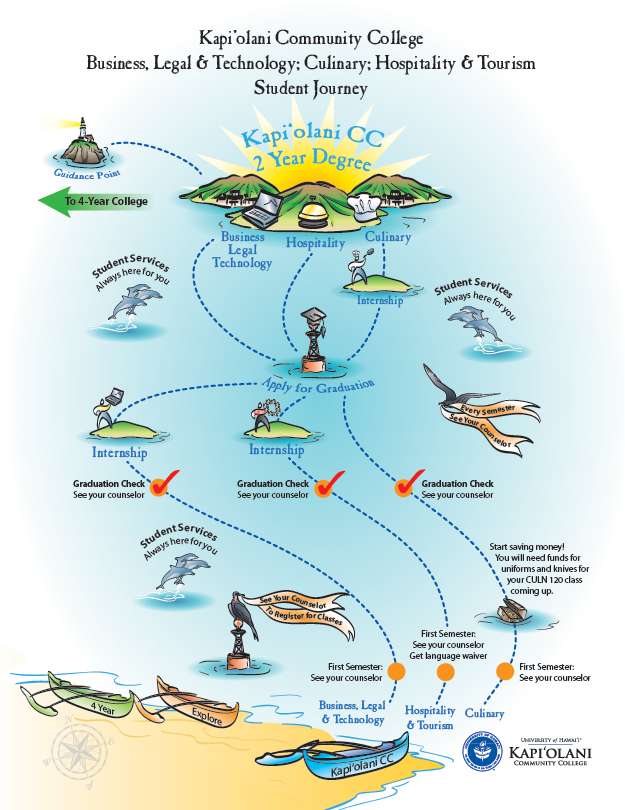 Icons from the map became Department Emblems and were applied to office name plates, faculty and staff name badges, and t-shirt “uniforms” at orientations and helped students easily identify campus resources. Students are able to see where they need to go, and who they need to see at specific stages of their educational journey.
