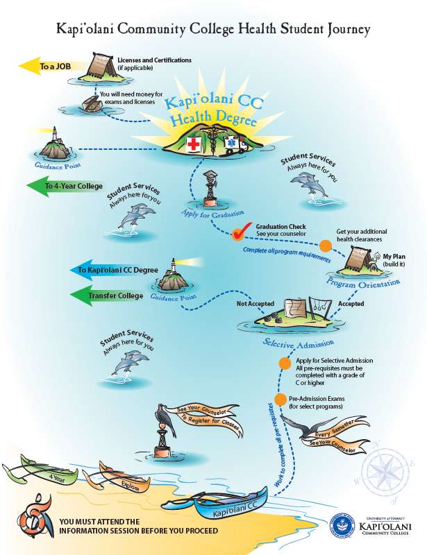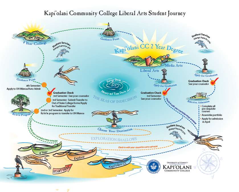 Our storymap provides an engaging way to present critical information in an easy to absorb way. We applied the metaphor of an ocean journey and created a student journey map that outlined critical tasks, resources and options available to new student applicants. The maps were incorporated into student recruitment materials and in academic course counseling sessions.