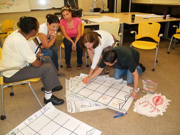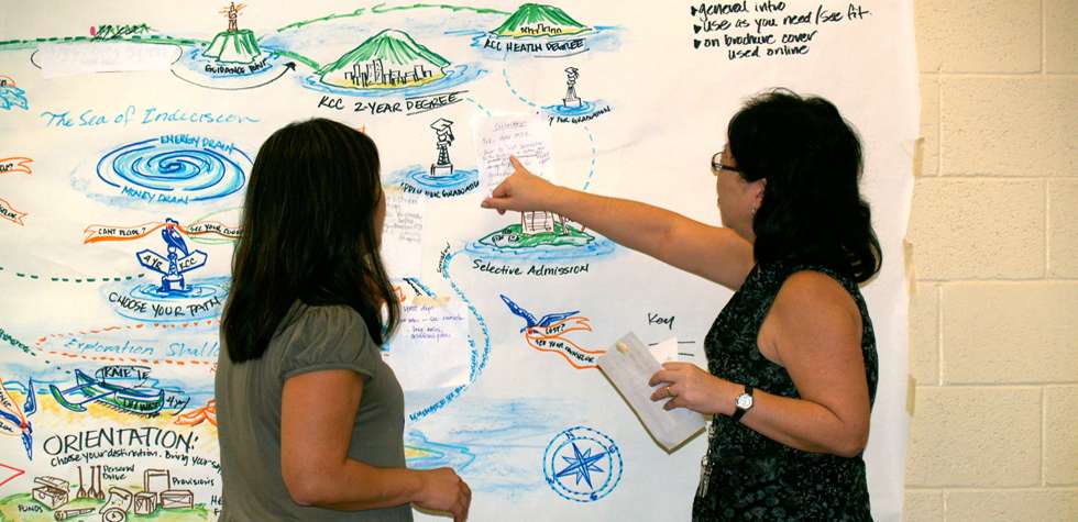 Graphic templates and worksheets provided a uniform work space that helped teams work together. Groups mapped out internal processes, recognize and resolve conflicts or confusion, and separate key student milestones from reams of overwhelming details.